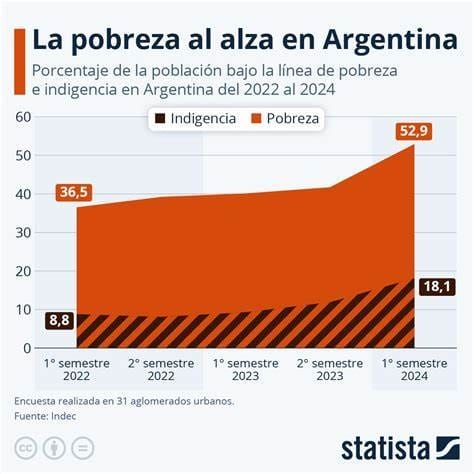 El INDEC informó que en el primer semestre de 2025 la pobreza bajó al 31,6 %, frente al 52,9 % del mismo período de 2024, y la indigencia descendió al 6,9 %, el nivel más bajo desde 2019. Sin embargo, especialistas y entidades como la UCA advierten que los números oficiales no reflejan del todo la realidad.